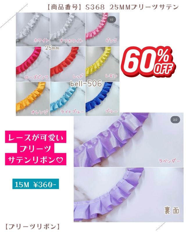 【プリーツ】25mmレース付きプリーツサテンリボン それぞれ約21M カット販売用として 以前のオンラインショップで販売していた 人気のリボン♡