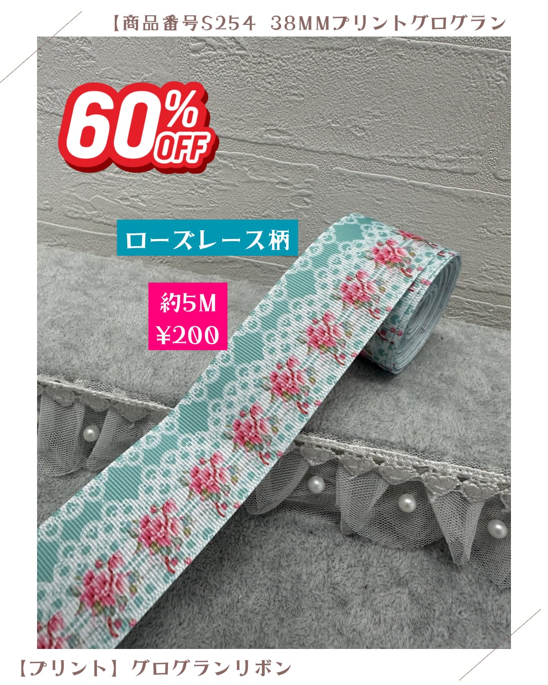 【ローズレース柄】38mmプリントグログランリボン