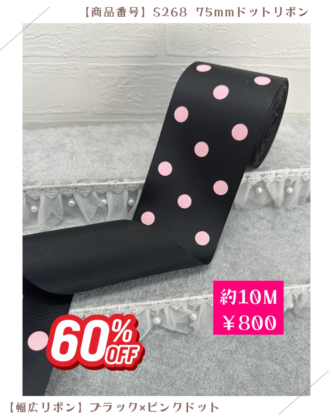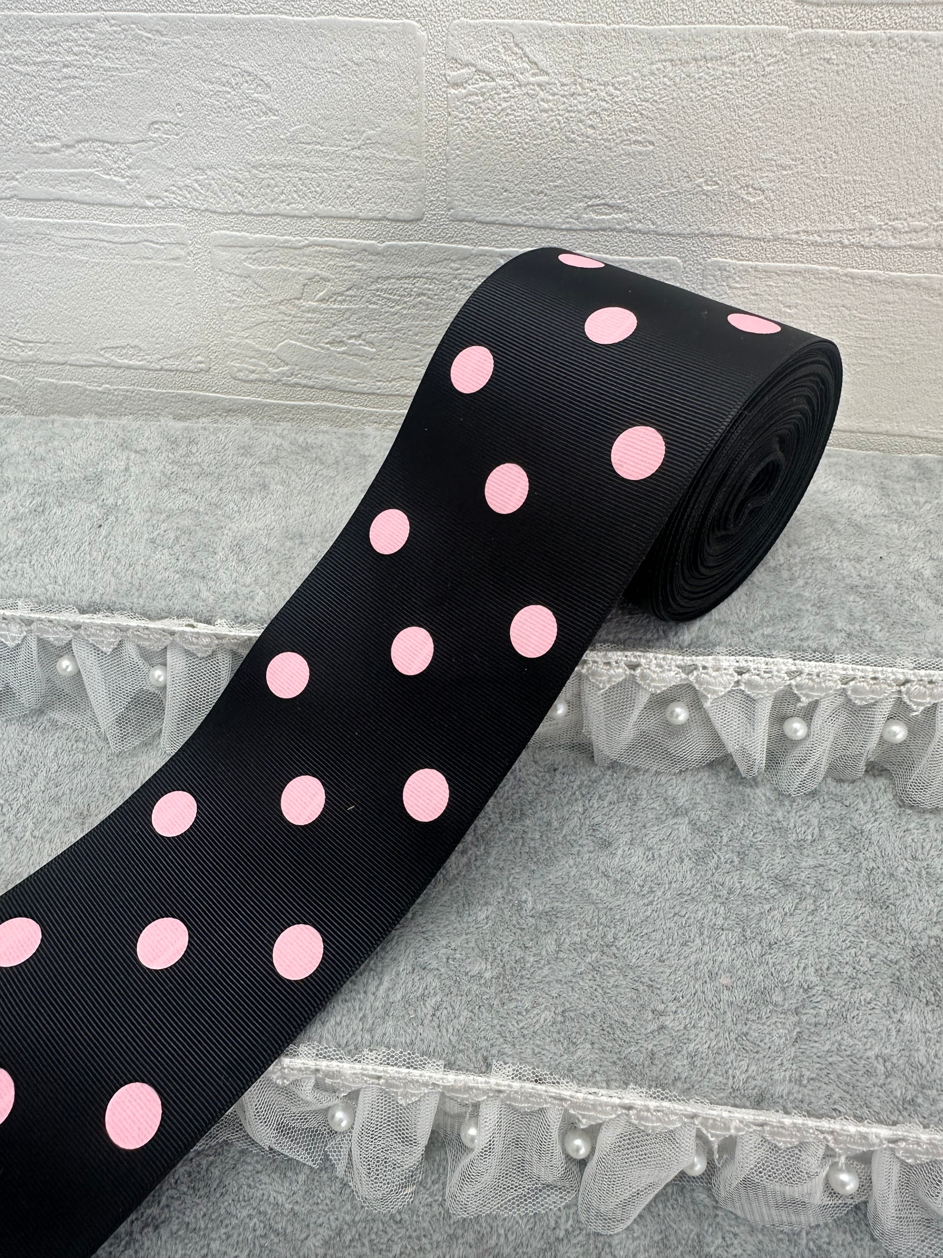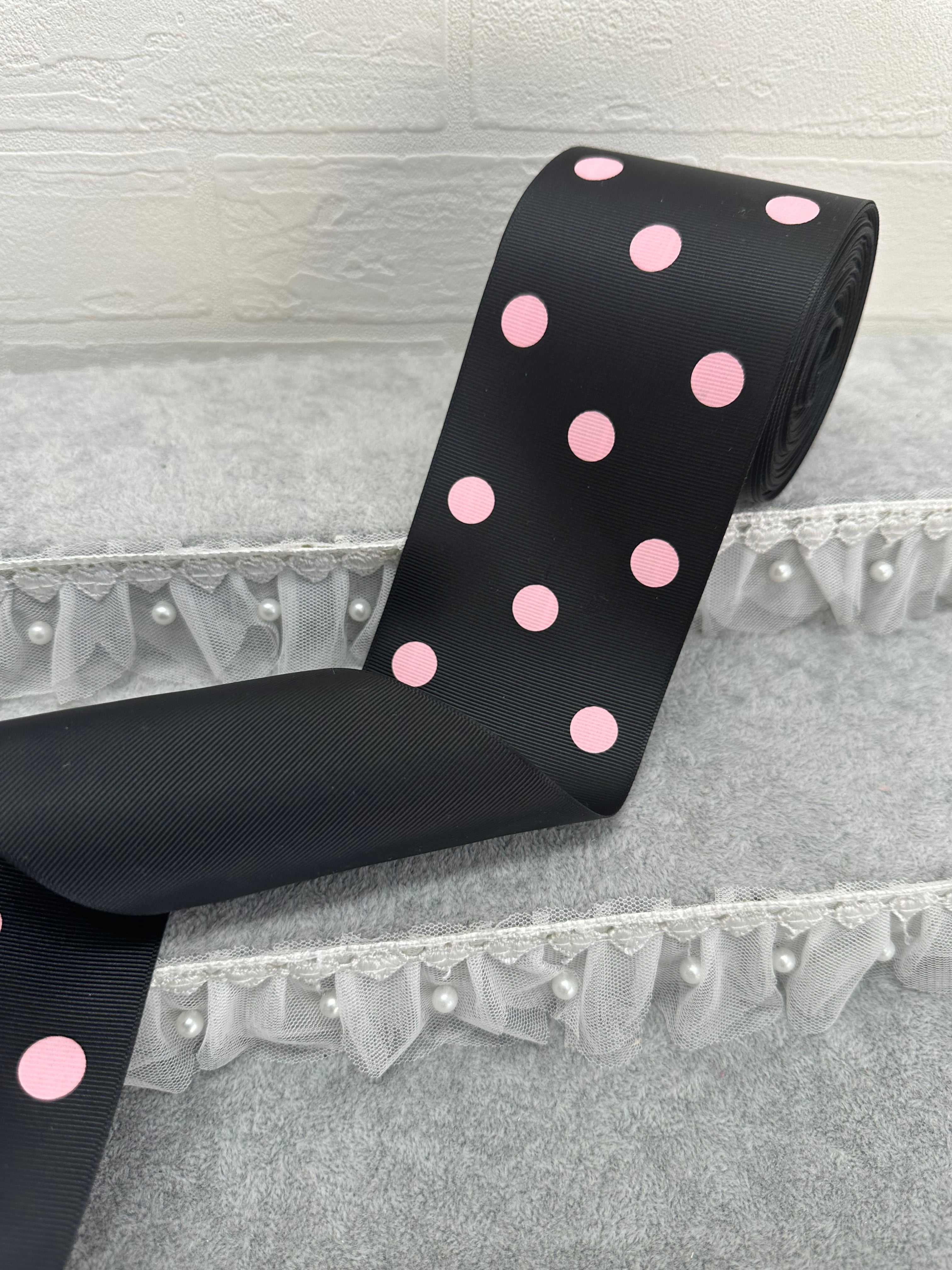【ブラック×ピンクドット】75mmグログランリボン