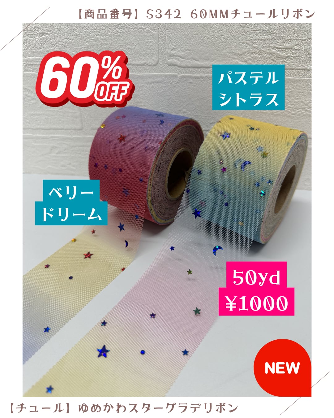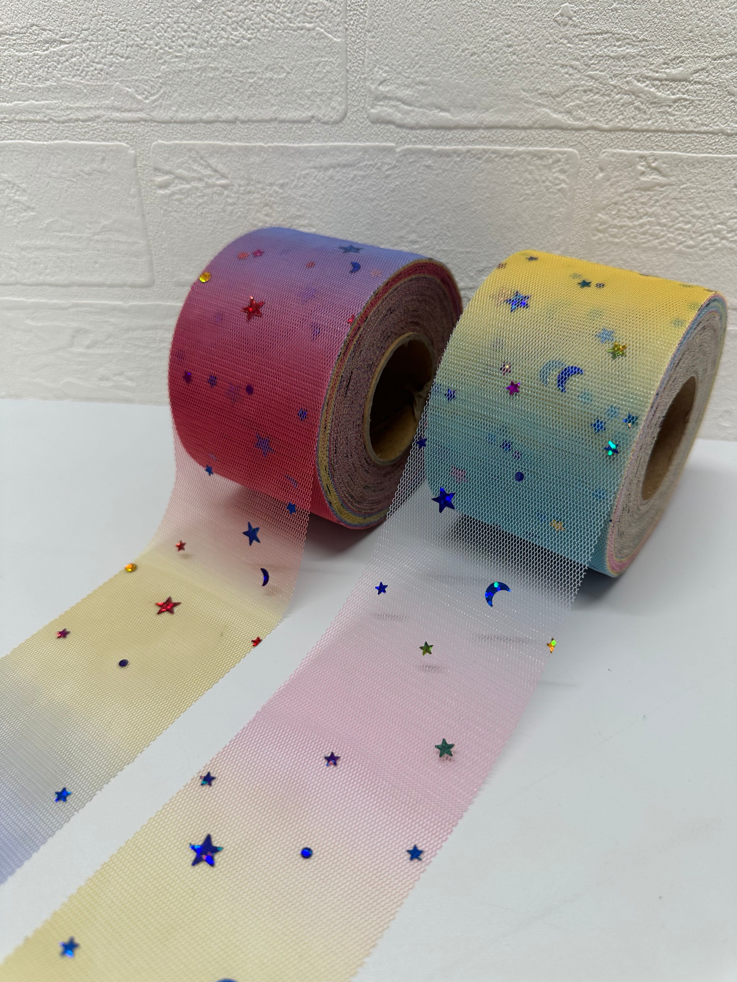 ふんわり透け感が可愛い、星ホログラム入りのチュールリボンです。