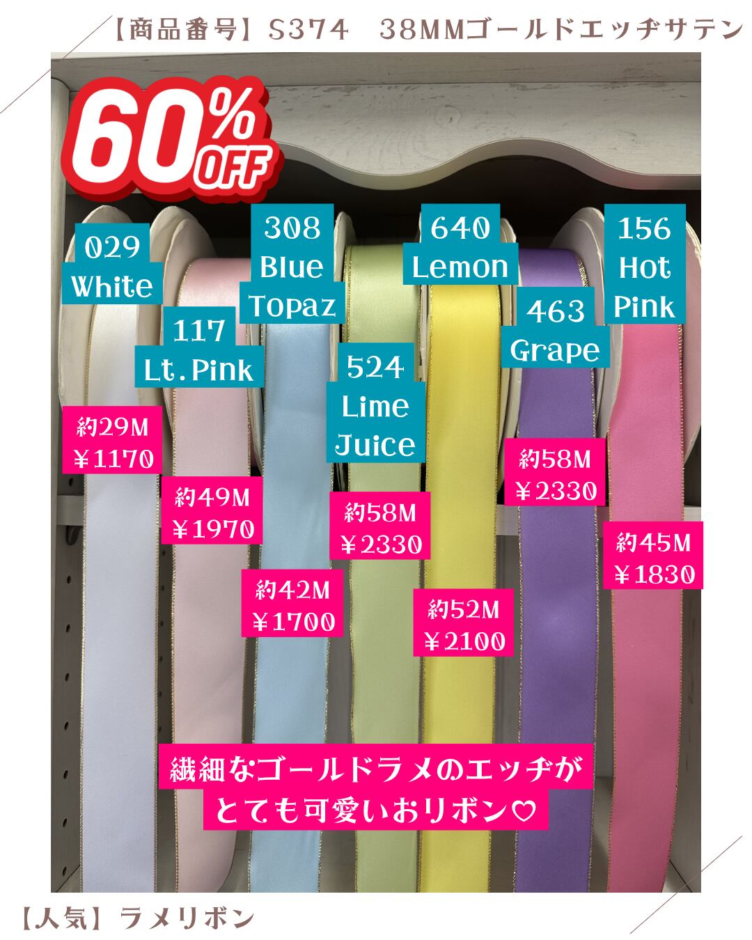 【人気】38mmゴールドエッヂ両面サテンリボン